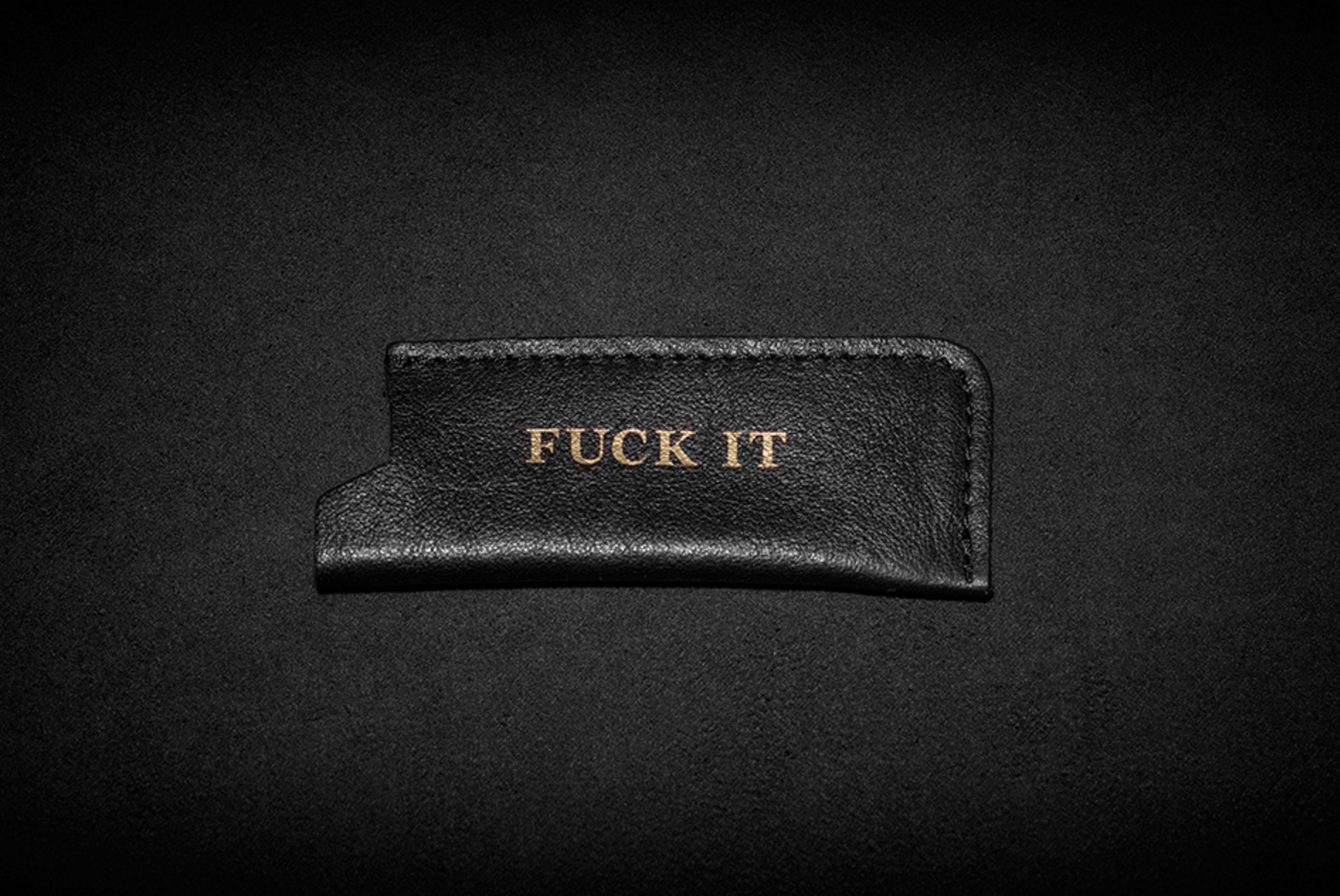 The capsule which includes high top sneakers, a hat, a zip round wallet, lighter case, backpack, holdall, keyring and bum-bag, all made from matt black calk leather, with the legend "FUCK IT" in gold lettering.